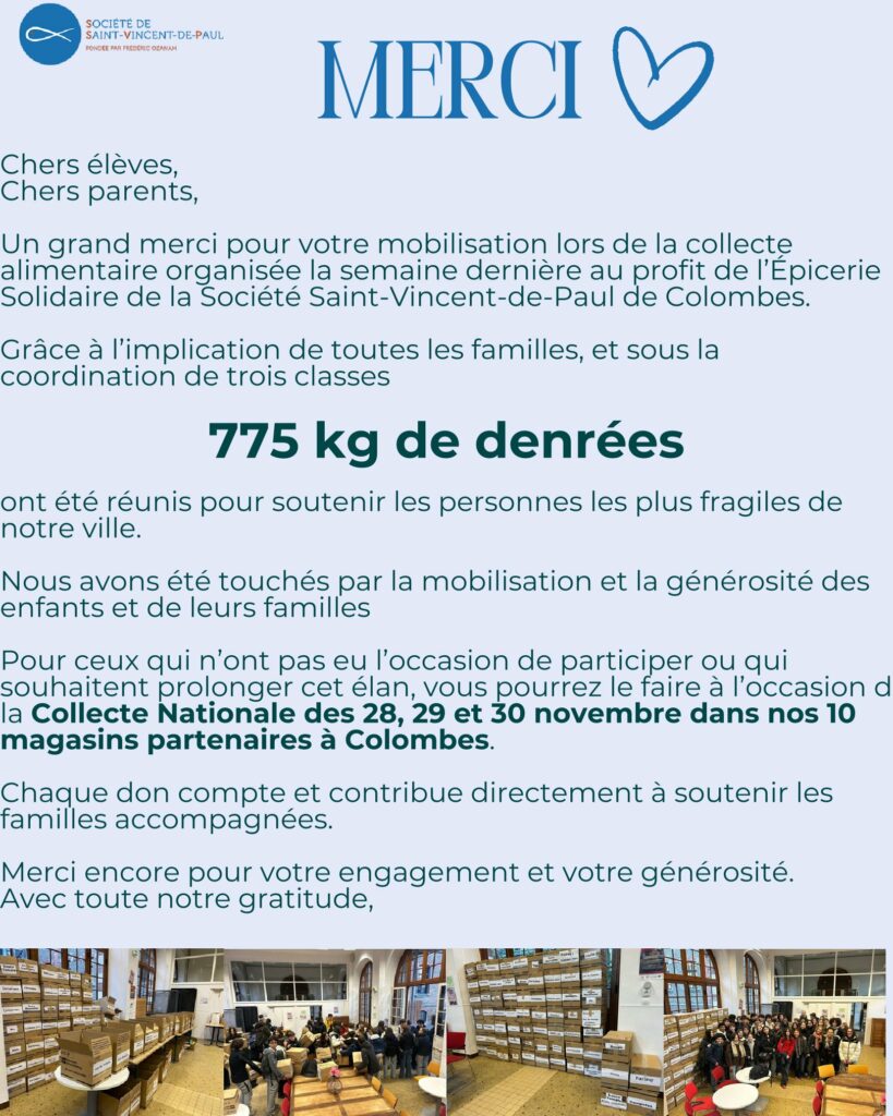 Grâce à votre générosité, la collecte alimentaire au profit de l’Épicerie Solidaire de la Société Saint-Vincent-de-Paul de Colombes a été un véritable succès : 775 kg de denrées récoltés pour venir en aide aux familles en difficulté.